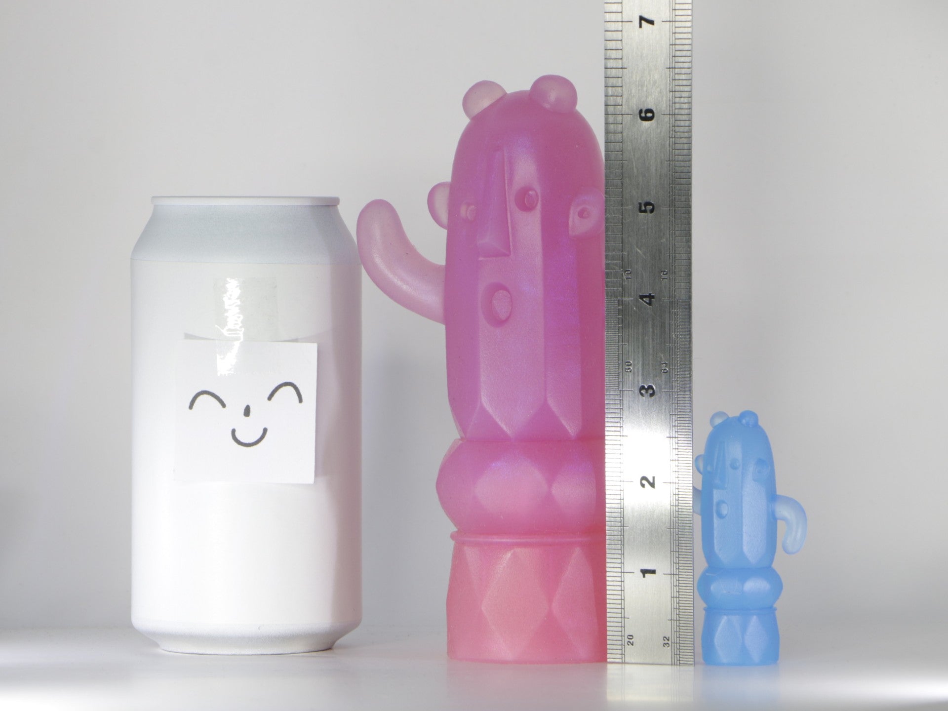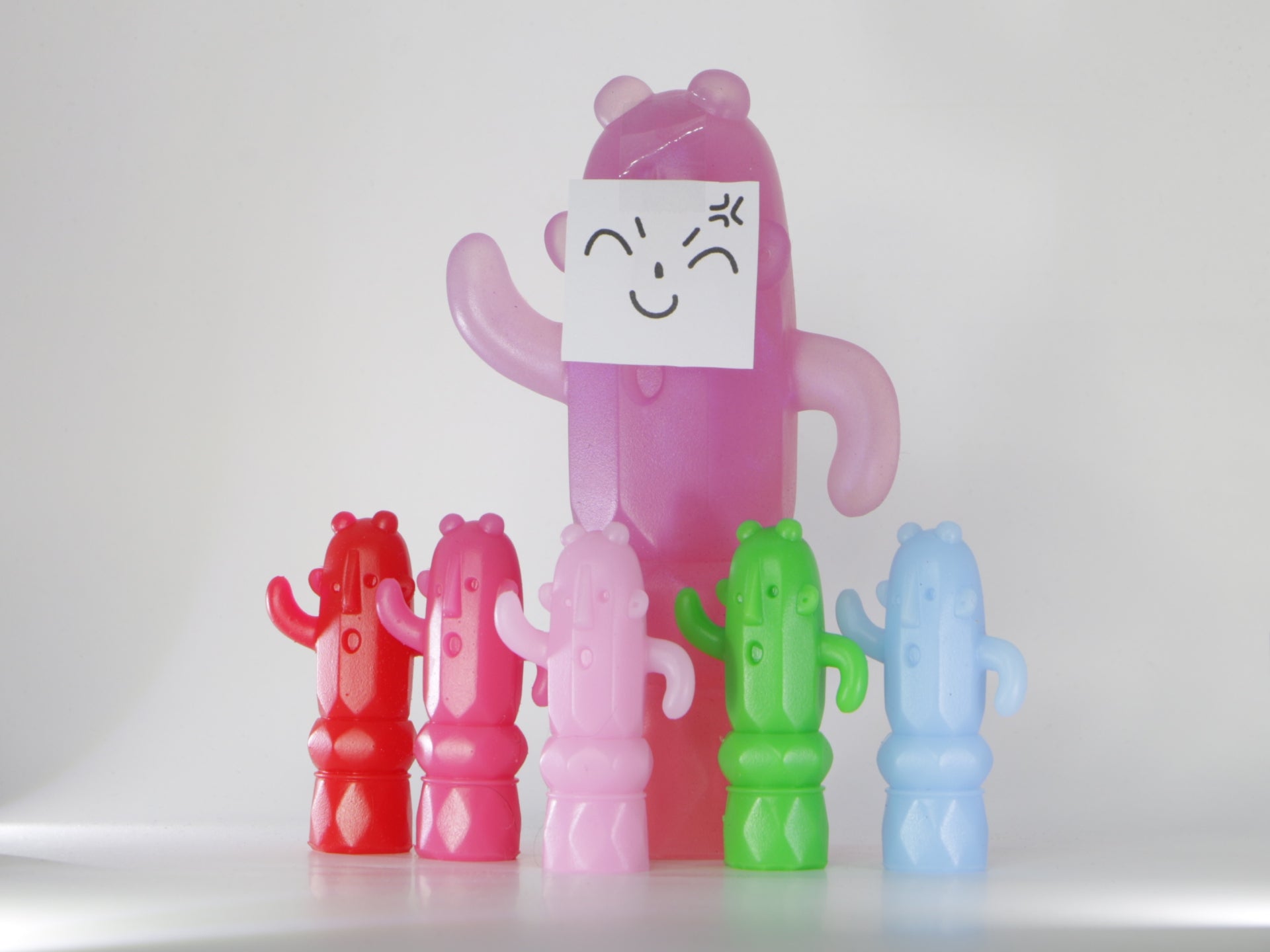 The colour of the larger haniwa in the photo and video is "double pink", with a dark pink body and light pink base. A concave base enables it to stick to smooth surfaces.